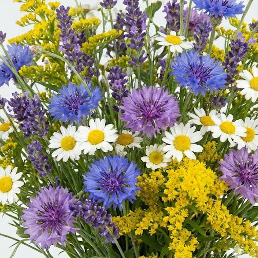 Inspired by a wild meadow, this charming bouquet features a mix of purple lavender, blue cornflowers, white daisies, and goldenrod, bringing a rustic, natural beauty indoors.