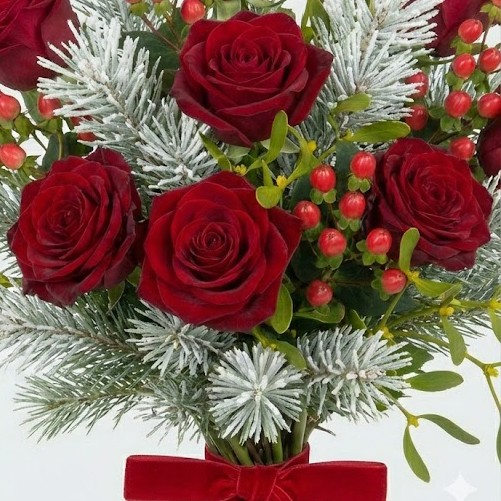 A celebratory bouquet perfect for the holiday season, featuring rich red roses, fragrant pine branches, festive red berries, and sprigs of mistletoe.