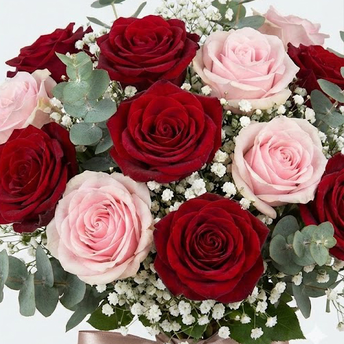 A classic and timeless arrangement of deep red and soft pink roses, beautifully complemented by delicate baby's breath and eucalyptus. This bouquet embodies romance and elegance.