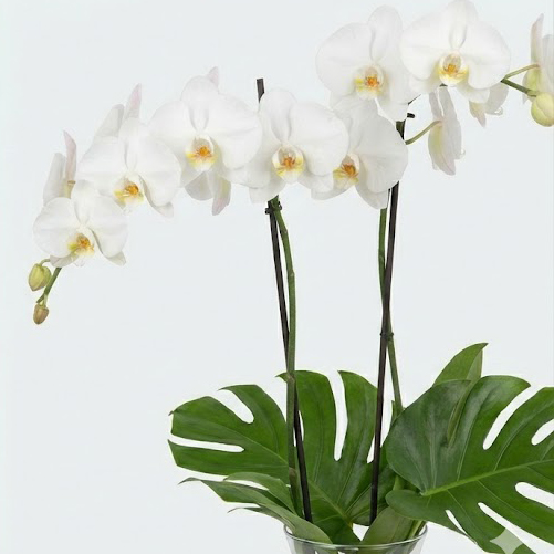 A sleek and modern minimalist arrangement, this bouquet showcases elegant white Phalaenopsis orchid stems with bold monstera leaves, perfect for a contemporary space.